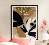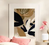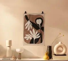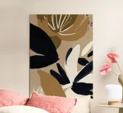 Un'astrazione floreale audace ed espressiva, con petali neri profondi contrastati da pennellate ocra, beige e avorio. I segni grezzi e strutturati creano un senso di movimento e profondità, perfetto per gli spazi contemporanei che prediligono l'arte grafica e di impatto.