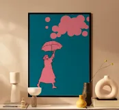 Un'illustrazione giocosa di una donna che si protende verso un cielo pieno di forme morbide e fluttuanti. Linee pulite incontrano colori vivaci in una composizione moderna e sognante.