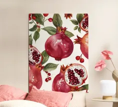 Pattern of Pomegranates fruits, leaves and flowers in pink and beige.