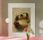 Una lontra giocherellona che si diverte a sdraiarsi sul dorso in acque calme poster con telaio in legno