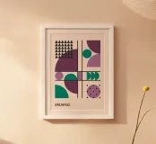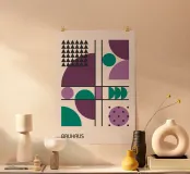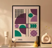 Questo poster giocoso e sofisticato è un classico omaggio alla scuola di design Bauhaus. La composizione è strutturata da una forte griglia di linee nere che ospita un vivace mix di forme geometriche: triangoli, cerchi e archi. L'opera bilancia grandi blocchi di colore, come il prugna intenso, il lilla tenue e il verde acqua, con motivi ripetitivi, tra cui un gruppo di piccoli triangoli neri e un cerchio viola a pois. Questo mix di ordine e geometria giocosa crea un'estetica unica e moderna. Questa stampa, scaricata in formato digitale, vanta una qualità superiore con una risoluzione di 7000x5000 pixel e 300 dpi. Questa