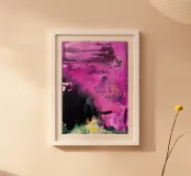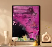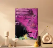 "Punk" è un'opera intensa e astratta che rappresenta una collisione esplosiva di colori e caos. La composizione è dominata da un'elettrizzante tonalità di fucsia e magenta, contrastata da un nero profondo e impenetrabile. La tecnica del flusso crea bolle effervescenti e bordi fluidi che trasmettono un'energia cruda e incontrollata. L'abbinamento aggressivo dei colori e la texture caotica riflettono l'estetica ribelle e il volume visivo del movimento punk. Alcune piccole macchie di giallo e verde nella parte inferiore spezzano la dominanza del colore principale.