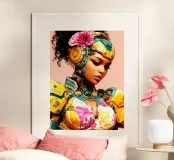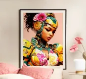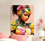 Una giovane e graziosa donna indossa abiti colorati e futuristici che sottolineano la sua vivace personalità. Il suo sguardo è pensieroso e fisso sul pavimento, come se fosse persa nei suoi pensieri. La scena irradia calma, malinconia e tranquilla introspezione.