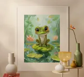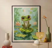 Rana seduta felicemente su una ninfea circondata da fiori poster