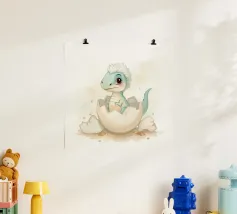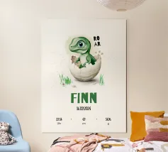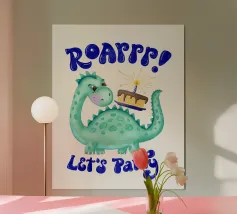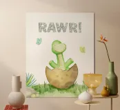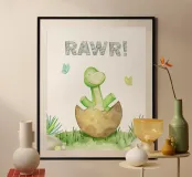A cheerful green dinosaur hatches from an egg, surrounded by colorful butterflies and lush grass. The word "RAWR!" is spelled out in stone-like letters above the dinosaur, adding a playful vibe to the scene.