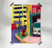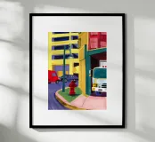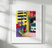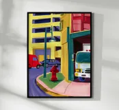 A bright red fire hydrant and a postbox stand on a city corner, their brilliant colors popping against the stylized buildings and street, a celebration of urban details.