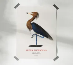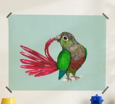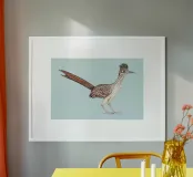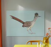 Disegno a matita colorata di un roadrunner maggiore. L'uccello è visto di lato, in modo che la sua lunga coda sia ben visibile nell'immagine.