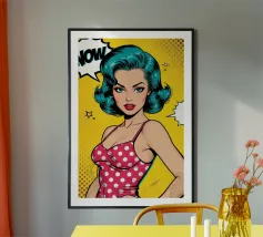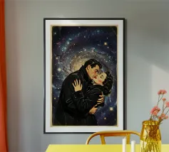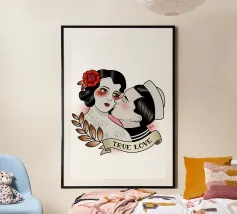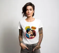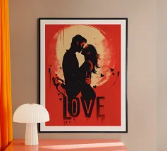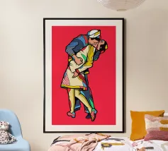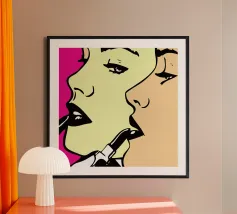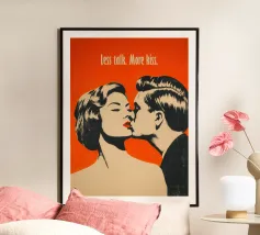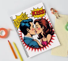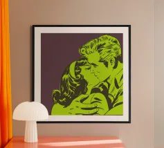 Una vivace illustrazione pop art di una coppia romantica in procinto di scambiarsi un bacio, circondata da bolle di testo in stile fumetto con le scritte "LOVE" e "KISS!". L'opera d'arte presenta colori vivaci, motivi a mezzatinta e un'estetica retrò anni Cinquanta.