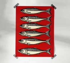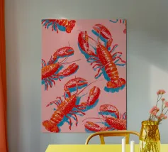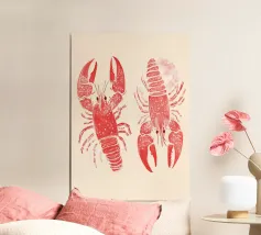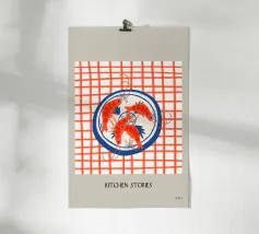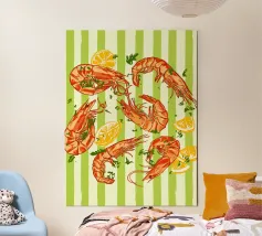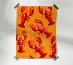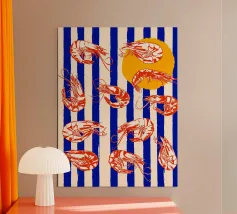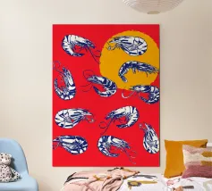 Lo stile è grafico e moderno, ridotto a forme e colori essenziali, il che conferisce al motivo una certa estetica da pop-art. La composizione è accattivante e gioca con i contrasti per enfatizzare visivamente i gamberi.