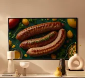 Salsicce grigliate guarnite con erbe aromatiche servite poster con telaio in plastica