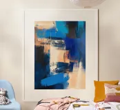 A contemporary abstract composition built from bold sapphire blue blocks, soft sand tones, and deep dark accents. Layered textures and geometric fragments create rhythm, contrast, and architectural depth. Ideal for modern interiors seeking structure, energy, and a strong visual presence.