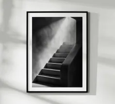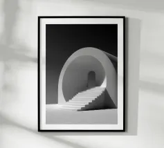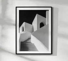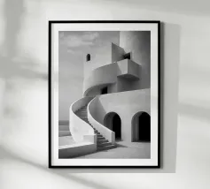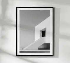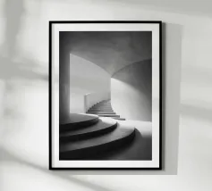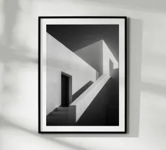 Poster in bianco e nero di un'architettura minimalista: scala esterna zigzagante, attaccata a una facciata chiara e tagliata da una luce ad angolo basso che proietta lunghe ombre grafiche. Linee pulite, cemento strutturato e un ritmo ripetitivo creano un'immagine geometrica ipnotica. Un elegante poster da parete per il soggiorno, l'ufficio o il corridoio, che dona sollievo, modernità ed equilibrio agli arredamenti contemporanei, scandinavi, industriali o giapponesi.
