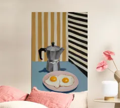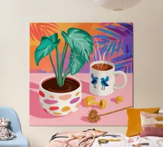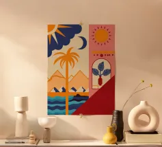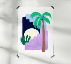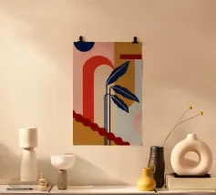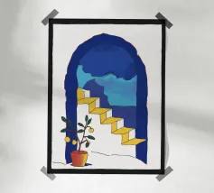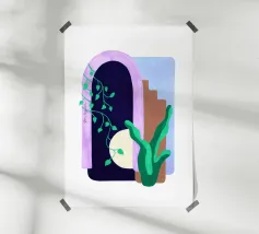 Una scena d'interni stravagante e astratta con una scala rosa, piante in vaso e un sole e una luna nel cielo visti attraverso un arco. L'opera d'arte è un paesaggio da sogno giocoso e bohémien.