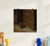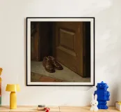 Scarpe classiche in pelle marrone posizionate davanti a una porta di legno poster con telaio in alluminio