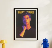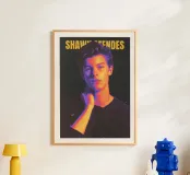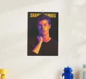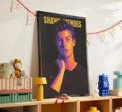 Un ritratto stilizzato di Shawn Mendes nei toni dell'arancione e del viola con il suo nome in grassetto giallo.