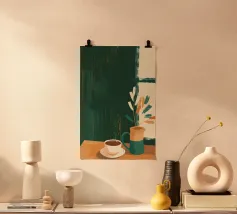 Questa opera d'arte contemporanea per interni cattura il tranquillo calore di una siesta mediterranea. La luce soffusa del sole si riflette sulle pareti strutturate e sulle lenzuola delicatamente stropicciate, creando un dialogo calmo tra luce e ombra. Un letto semplice, una porta aperta e sottili accenti botanici evocano la quiete, il riposo e una vita lenta. Le tonalità tenui del crema, del verde salvia e del legno caldo conferiscono alla composizione una qualità ariosa e senza tempo. L'astrazione pittorica enfatizza l'atmosfera rispetto ai dettagli, invitando lo spettatore a un momento di pausa e riflessione. Ideale per interni moderni, hotel boutique o collezioni di stampe d'arte curate.