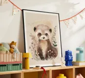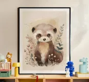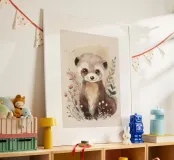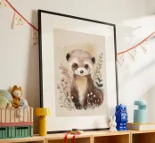 Simpatica illustrazione di un furetto giocherellone circondato da delicate poster con telaio in legno