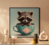 Simpatico procione in una tazza decorativa blu si mette in posa giocosamente poster con telaio in legno
