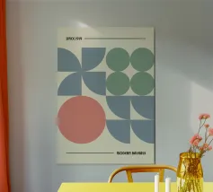 Minimalistisch, modern und harmonisch – dieses Design vereint geometrische Formen zu einer stilvollen Komposition. Das Motiv besteht aus symmetrisch angeordneten Halbkreisen und Viertelkreisen in einer ausgewogenen Farbpalette aus sanftem Blau und dezentem Beige. Die klaren Linien und die rhythmische Wiederholung der Formen verleihen dem Design eine beruhigende und zeitlose Ästhetik.
