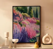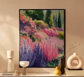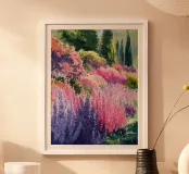 Un prato è pieno di alte guglie di fiori di lupino rosa e viola, le cui forme morbide e verticali creano un paesaggio romantico e sognante che sembra rigoglioso e pieno di vita.