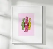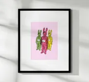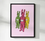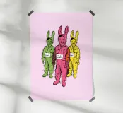Un'eccentrica illustrazione a inchiostro e pennarello con tre figure colorate vestite da conigli - in egual misura giocosa e surreale.