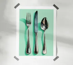 Un'audace illustrazione minimalista di una forchetta d'argento posizionata su un fascio di spaghetti giallo brillante su uno sfondo verde acqua. Le forme pulite e le ombre nitide conferiscono un tocco di pop art moderna. Un poster da parete per la cucina perfetto per gli amanti del cibo italiano e per gli interni contemporanei.