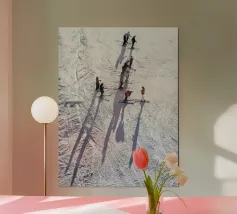 Un sereno paesaggio aereo mostra sciatori solitari sparsi su una distesa bianca e incontaminata, le cui piccole sagome tracciano sottili percorsi lungo il pendio. In basso, un piccolo boschetto di sempreverdi smerigliati completa la composizione. L'ampio spazio negativo e la delicata texture della neve trasmettono solitudine, libertà e il silenzio della natura selvaggia invernale. Ideale per interni minimalisti, angoli di studio o spazi in stile scandinavo, questa stampa celebra la bellezza della semplicità e la tranquilla gioia dell'avventura solitaria in montagna.