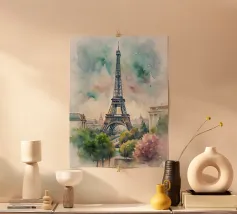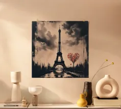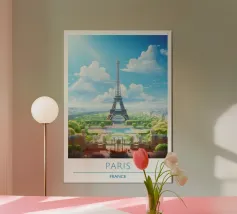 Questa rappresentazione iperrealistica della Torre Eiffel mostra la sua imponenza incorniciata da delicati fiori di ciliegio rosa in piena fioritura. L'immagine, ambientata in un cielo blu intenso punteggiato da soffici nuvole bianche, cattura il contrasto armonioso tra l'intricata struttura in ferro della torre e gli eterei petali. I fiori incorniciano la scena, attirando lo sguardo verso l'alto in direzione dell'iconica guglia, creando un'atmosfera romantica e sognante. Questa composizione serena incarna l'essenza del fascino parigino e del rinnovamento primaverile.