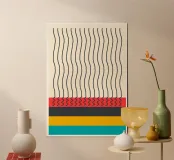 Questo vibrante poster astratto cattura l'essenza del Mid-Century Modern e del design grafico contemporaneo. La sezione superiore presenta una serie di delicate linee nere ondulate disegnate a mano su uno sfondo bianco sporco, creando un senso di movimento e consistenza. In basso, la composizione è ancorata da blocchi di colore di un rosso intenso con un bordo inferiore frastagliato, grigio antracite, giallo senape e un brillante blu verde acqua. Questo pezzo giocoso ma sofisticato è perfetto per aggiungere un tocco di colore e di fascino retrò a qualsiasi spazio abitativo. Consegnato come file digitale di qualità superiore a 7000x5000 pixel, 300 dpi, per un'ottima qualità di stampa.