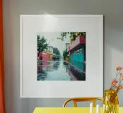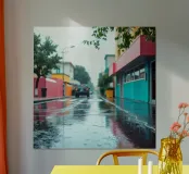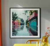 Strada bagnata dalla pioggia con edifici colorati che riflettono l'acqua poster con telaio in plastica