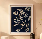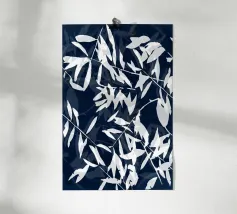A striking cyanotype-style composition capturing delicate white leaves drifting across a deep indigo field. This piece evokes early botanical photography with a contemporary edge—organic yet graphic, timeless yet modern. Perfect for interiors that lean toward minimalist naturalism or vintage scientific aesthetics.