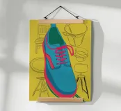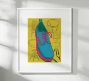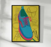A graphic illustration of a single blue sneaker with red laces against a bright yellow background. The stylized, close up view creates a bold and modern piece of pop art.