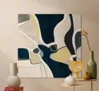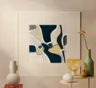 Abstract composition of various forms in shades of beige, off-white, dark navy blue and black. The shapes are irregular and layered, with areas of solid color and areas of texture. Some white lines and strokes define the edges of the shapes. The piece is predominantly neutral tones with pops of yellow ochre. The composition is balanced, with shapes of varying sizes placed throughout the image. Colors are muted and create a calm and serene atmosphere. The overall impression is one of organic forms and textures.