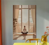 A calm digital painting of a woman practicing yoga as sunlight streams through tall windows. The golden hues and minimal composition create a tranquil, meditative energy — a gentle reminder to begin each day with intention and peace.