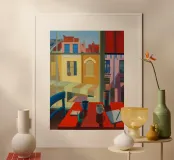 Sun-kissed rooftops beyond an indoor table set in vibrant red hues conjure a dynamic contrast of intimacy and view.
