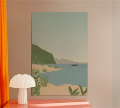 Una dolce barca a remi galleggia su acque specchiate, immersa in sognanti tonalità di rosa e lilla. Le montagne stratificate sfumano in lontananza sotto un sole tranquillo, evocando un senso di connessione tranquilla e di tempo sospeso. Una composizione poetica di quiete, natura e calma emotiva.