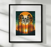 Sunset SereA captivating digital art depicting a serene forest at sunset. The tall, silhouetted trees stand tall against a vibrant backdrop of orange and yellow hues, creating a breathtaking scene. The setting sun casts long shadows, adding depth and dimension to the composition. This artwork evokes feelings of tranquility and peace, making it a perfect addition to any modern home.nade