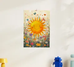 Dieses bezaubernde Motiv zeigt eine lächelnde Sonne mit geschlossenen Augen, umgeben von einem weichen, rosafarbenen Himmel und üppigem, grünem Laub. Die harmonischen Gelb- und Rosatöne schaffen eine beruhigende und fröhliche Atmosphäre, die ideal für Kinder geeignet ist. Dieses Design strahlt Ruhe und Wärme aus und eignet sich perfekt als Poster, Wanddekoration oder für bequeme Oberteile, die jedes Kind mit einem Lächeln begleiten. Perfekt für kleine Träumer und Naturliebhaber, die ihre Liebe zur Sonne und den sanften Farben des Sommers zum Ausdruck bringen möchten.