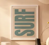 Questo poster di surf in blu e beige porta lo spirito della spiaggia, del mare e del surf direttamente sulla vostra parete. Con una tipografia moderna, è la decorazione murale perfetta per il soggiorno, la camera da letto o il corridoio.