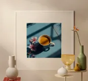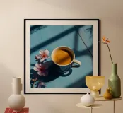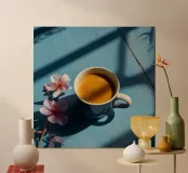 Tazza da caffè con fiori di ciliegio su tavolo di legno blu poster con telaio in legno