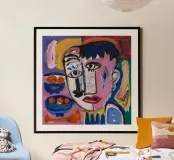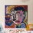 This artwork shows a face with a tear and a mix of colors. The background includes abstract shapes and patterns, adding to the emotional depth of the painting.
