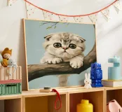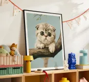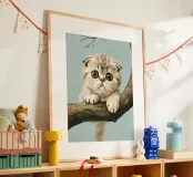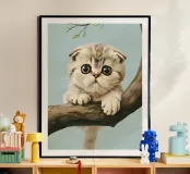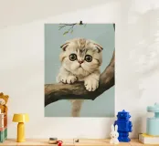 Tenero gattino con occhi luminosi che si arrampica su un ramo in primavera poster