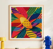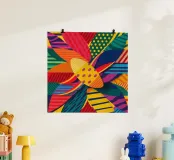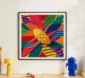 Un'opera d'arte astratta ricca e complessa intreccia vari motivi colorati, texture e forme, creando un arazzo artistico e visivamente stimolante di elementi di design.