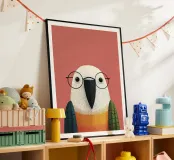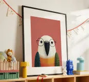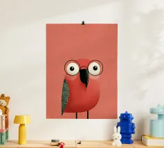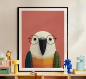 Un'illustrazione minimalista che raffigura un uccellino calmo e attento con occhiali rotondi, su uno sfondo caldo e tenue. La composizione equilibrata, le linee pulite e le texture delicate trasmettono un senso di tranquilla intelligenza e delicata curiosità.