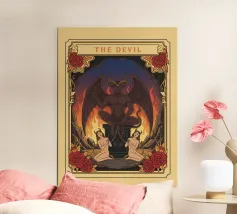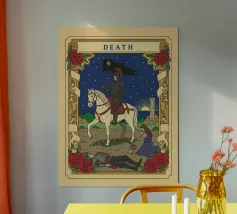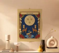 Vintage tarot card of a skeleton reading under the crescent moon.