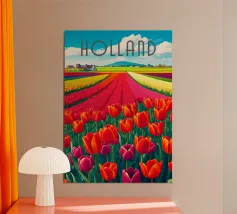 This striking impasto-style composition presents a narrow gray path cutting through expansive fields of intense red, with a warm band of golden orange running alongside it. The heavy, tactile brushstrokes create a rich surface texture, emphasizing depth and movement. Three small figures walking together introduce a subtle human narrative, suggesting unity, choice, and shared direction. The bold color contrasts and vertical composition transform a simple path into a powerful metaphor for journey and connection within an abstracted landscape.