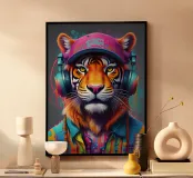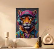 Tigre con berretto e cuffie poster