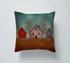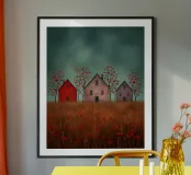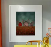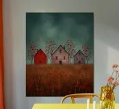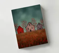 Three silent shapes against the breeze, Standing still on the edge of time, With windows like heavy, shuttered eyes O’er a field of poppies and sighs. The earth burns with an ancient red, While the sky, in its weary green, Rests on the roofs like a secret unsaid. No footstep falls, no voice is heard, Only the wait for those long gone, Midst barren trees with blossoms of blood.