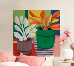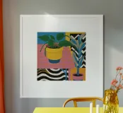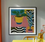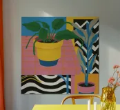 A potted houseplant with lush green leaves sits on a pink table. The background is a dynamic mix of geometric patterns, including a bold black and white design, creating a modern interior scene.
