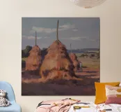 A classic rural landscape centered on two large, prominent haystacks standing in a sunlit field, with a figure engaged in farm work nearby, and a distant treeline or village visible under a bright summer sky.